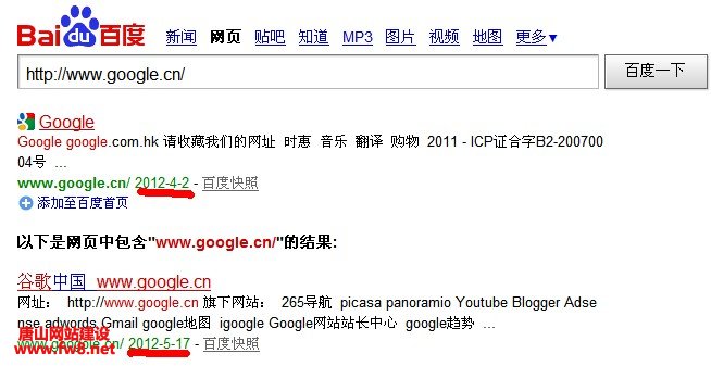 谷歌中国存在两个百度快照,慢的距离现在差了近两个月
