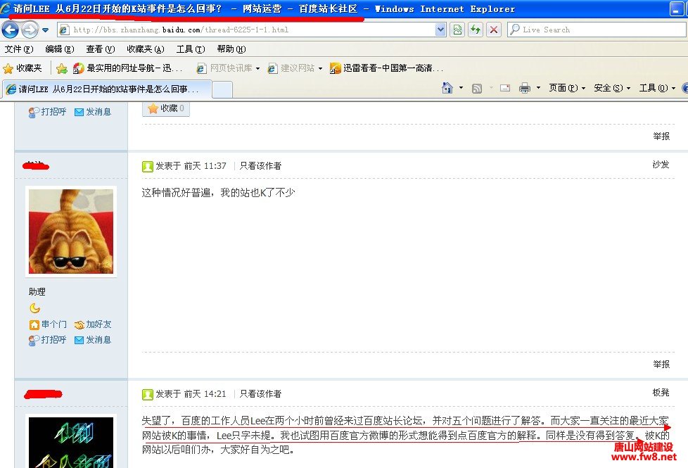 一波未平,一波又起,在这些网站百度收录量没有好转的时候,更多网站友情链接中出现了大量首页被K(无百度快照)的网站,一时间太多站长手忙脚乱,马上忙着下友情链接,企图自保。但6月22日以后,很多原来在业界之内有一定权威性,行业关键词排名较好的网站关键词排名突然消失,百度权重归零。之后几天,更多的网站也相继落马,甚至许多网站被K站,一时间各种站长论坛哀叹声、骂声一片。