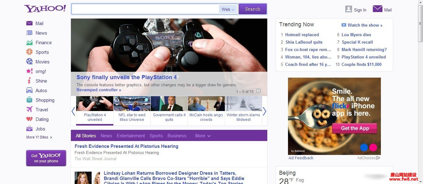并且,雅虎主页用户还可以对天气和股票信息进行调整。而雅虎的服务链接则设计在页面左侧,通过一个名为“当下趋势”(Trending Now)的侧边栏告诉用户现在有哪些热门的网络趋势。
